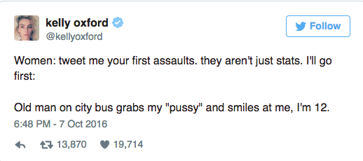 And so for months now, Trump and his campaign have been triggering women across America, forcing them to think about and relive trauma and abuse they’ve endured. Writer Kelly Oxford broadcast on Twitter, “Women: tweet me your first assaults. they aren’t just stats. I’ll go first: Old man on city bus grabs my “pussy” and smiles at me. I’m 12.”